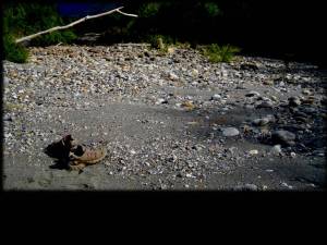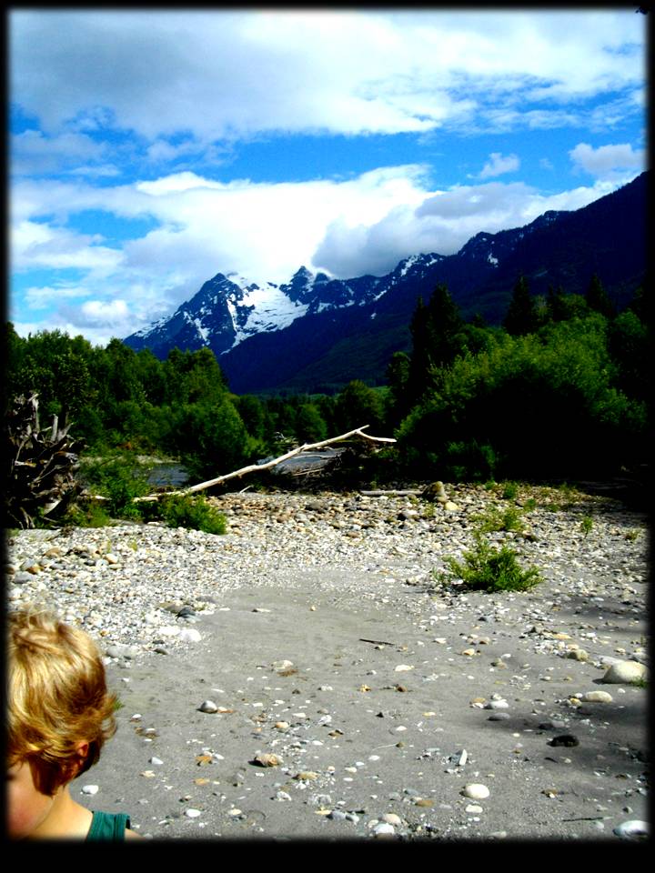 I join them in the floating of woody debris down the river. I help them push a small dry alder with its bare root wad attached into the main current of the river. We all lob rocks and dirt at it until it swirls in circles and twirls away downstream. This is a game my son, husband, and I play frequently here down by the river, in spring, summer, fall, and winter. I root around in the pile of debris, much of it ten to fifteen feet over our heads, most of it too big to carry. A grand big leaf maple lays stretched out along the gravel bar, and from underneath it pokes the still green but rusting boughs of a cedar tree. I find a water logged and heavy chunk of wood, pull it out and lift it up  – carry it to the river’s edge.  When they are in place I heave it, as far as I can, out into the current of the river, fully expecting it to sink, but it doesn’t, it submerges briefly, then pops up, swirls about and heads down stream. They throw rocks once again, run along the water’s edge until the log floats out of sight. They jump up and down, wave their fists in the air, and scream for it to come back.