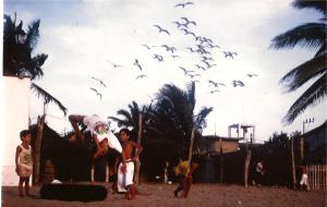 We continue to Coba. We pass a tiny little store where children run out after us waving and shouting. We spend the whole afternoon at Coba walking among the ruins. The man takes pictures of Jay and me along the tiny narrow steps that lead to top of a pyramid, smiling. We climb to the top, like mountain climbers. At the top Jay puts his arm around my shoulders, grins and the man takes a picture. We are happy at our good fortune, below us the jungle spreads out like an ocean, beautiful and green and dazzling.