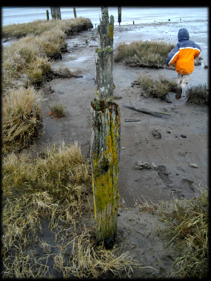 I watch as my son crawls up onto a fat log – an old growth cedar with a giant root ball still attached, though the roots are bare and grown through with grass.  The log has travelled downstream from the mountains.  The entire mudflat here is strewn with these logs; remnants of floods and high waters, souvenirs of the grand trees that grace the slopes above us.  He stands up and walks along the top of the log.  It’s long straight trunk slopes downward into the cattails.  I follow.  My son bends over and pulls at the browned broken leaves of the cattails.